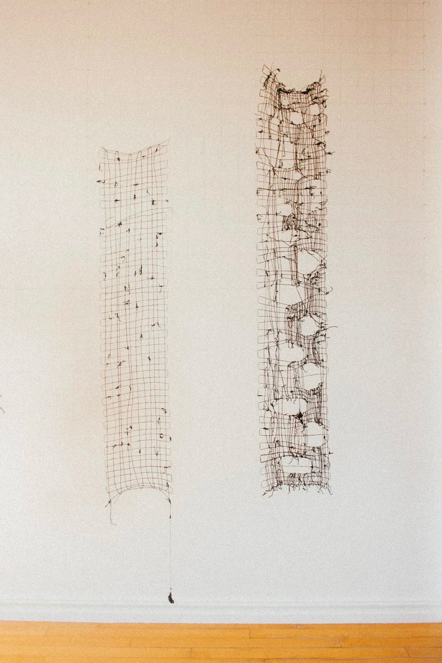 Ligia y Maria José [Tejiendo El Petróleo] // Maria Elena Pombo// 2024// Venezuelan Crude Oil, Brown Alage Extract, Glycerin, Water // 91.4 x 182.9 x 5 cm. Zona Maco, Mexico City.